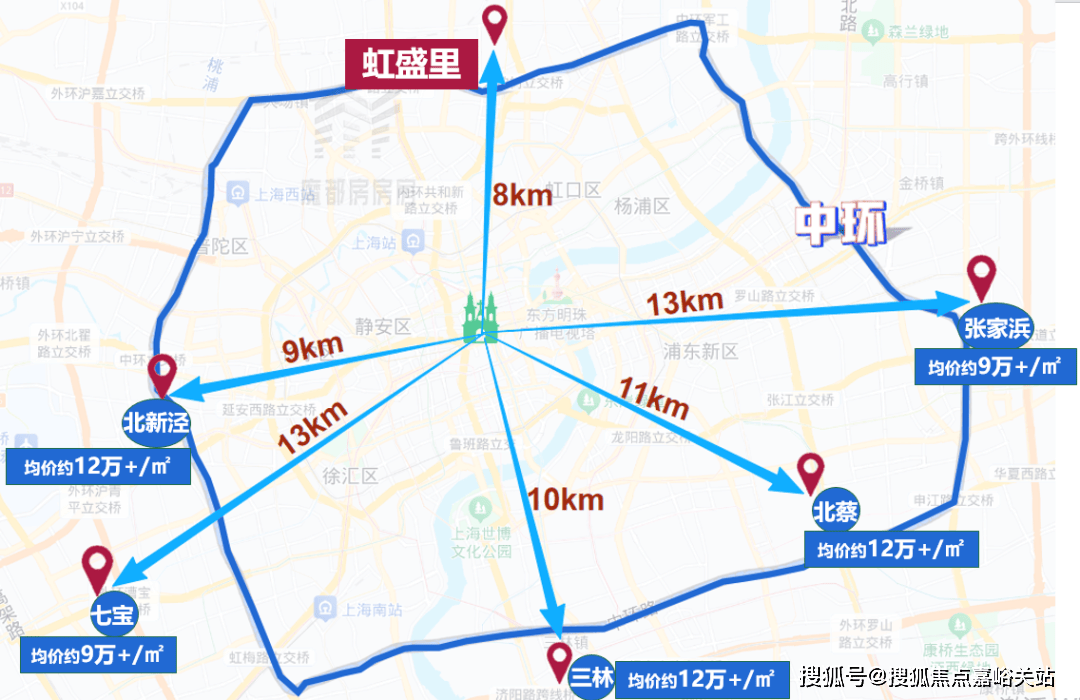 但到人民广场的距离却更远了!例如位于上海南部、浦东三林板块的项目,距人民广场直线万+/㎡,还有位于上海西面的北新泾项目、上海东面的北蔡项目等等。